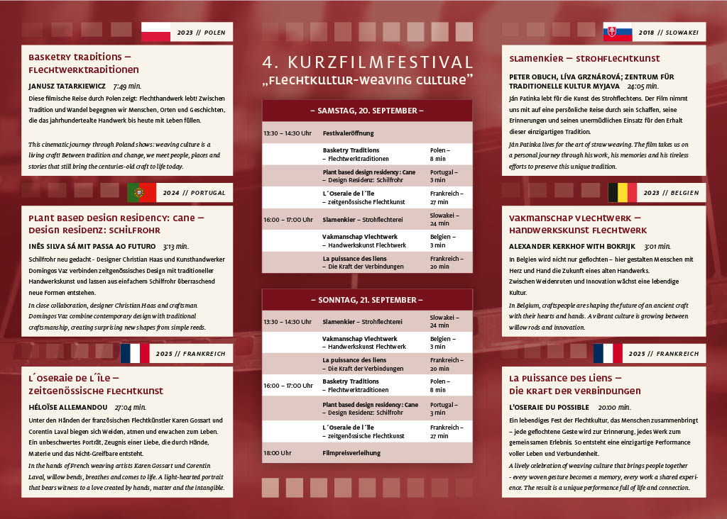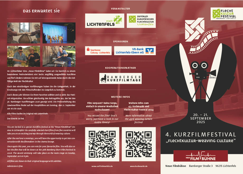 Im Rahmen des Internationalen Korbmarktes 2025 durfte ich das 4. internationale Kurzfilmfestival „Flechtkultur – Weaving Culture“ in der Neuen Filmbühne Lichtenfels kuratieren und begleiten. Sechs Kurzfilme aus fünf Ländern eröffneten eindrucksvolle Einblicke in die Vielfalt des Flechthandwerks – als gelebte Tradition, als zeitgenössische künstlerische Praxis und als kulturelle Verbindung zwischen Menschen und Generationen.